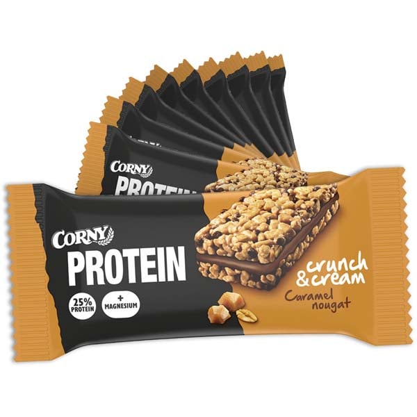 Kokeile uutta Corny Crunch & Cream Caramel Nougatia, erittäin maukasta proteiinipatukkaa, jossa on kolme kerrosta. Rapeat riisi- ja vehnämurot sekä täyteläinen karamelli- ja nougatkreemi on lyömätön yhdistelmä! Jokainen patukka sisältää 25 %proteiinia ja on myös täydennetty magnesiumilla, joka edistää normaalia lihasten toimintaa. Täydellinen välipala tai välipala, kun olet "liikkeellä" ja tarvitset hieman ylimääräistä proteiinia.