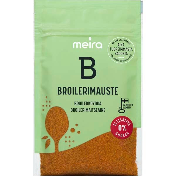 Meira Broilerimauste on mausteseos erilaisten broileri-, liha-, ja kalaruokien maustamiseen. Kokeile esimerkiksi padoissa ja kastikkeissa. Meiran mausteet ovat aina tuoreimmasta sadosta, jolloin kaikki luonnolliset makuaromit ja tuoksut ovat tallella.